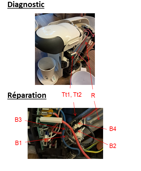 Précautions: Débrancher la machine à thé avant de la démonter et tester les thermostats Tt1 et Tt2 hors tension.
