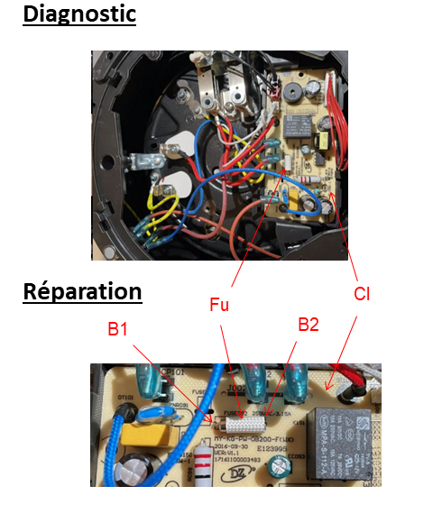 Après démontage, hors tension, au multimètre on réalise un test de continuité entre les bornes B1 et B2 d’extrémité du fusible électrique Fu de la carte électronique Cl et on remarque ne pas avoir de continuité entre ces deux bornes.